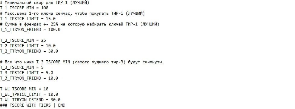 TSCORE_HOLD_LIMIT = 2 - эта настройка отвечает за отмену покупки, если вы уже являетесь владельцем двух ключей в этом клубе. Цифру можем изменять как угодно, но я бы не стал ничего менять, ведь при докупках мы с большой вероятностью можем потерять деньги, потому что, кто-то просто закроется об нас.